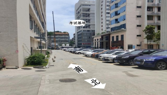 3)(如圖三所示)沿著小坡方向繼續(xù)前行約50米,走到第一個十字交叉路口后左拐,(如圖四所示)再沿著箭頭往南的方向繼續(xù)前行,即可看到考試基地大樓。