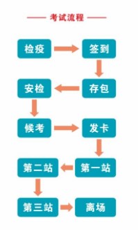 5)本考場考試流程為:檢疫、簽到、存包、安檢、候考、發(fā)卡、第一站、第二站、第三站、離場。