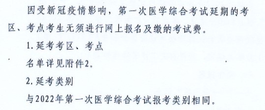 與2022年第一次醫(yī)學(xué)綜合考試報考類別相同(包含臨床執(zhí)業(yè)/助理醫(yī)師、具有規(guī)定學(xué)歷中醫(yī)執(zhí)業(yè)/助理醫(yī)師、中西醫(yī)結(jié)合執(zhí)業(yè)/助理醫(yī)師、口腔執(zhí)業(yè)/助理醫(yī)師、公衛(wèi)執(zhí)業(yè)/助理醫(yī)師、鄉(xiāng)村全科助理醫(yī)師、師承或確有專長中醫(yī)執(zhí)業(yè)/助理醫(yī)師等。),第一次醫(yī)學(xué)綜合考試延期的考區(qū)、考點考生無須進行網(wǎng)上報名及繳納考試費。