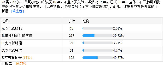 臨床醫(yī)師“支氣管擴(kuò)張”易混淆考點(diǎn)??季毩?xí)正確率49.77%