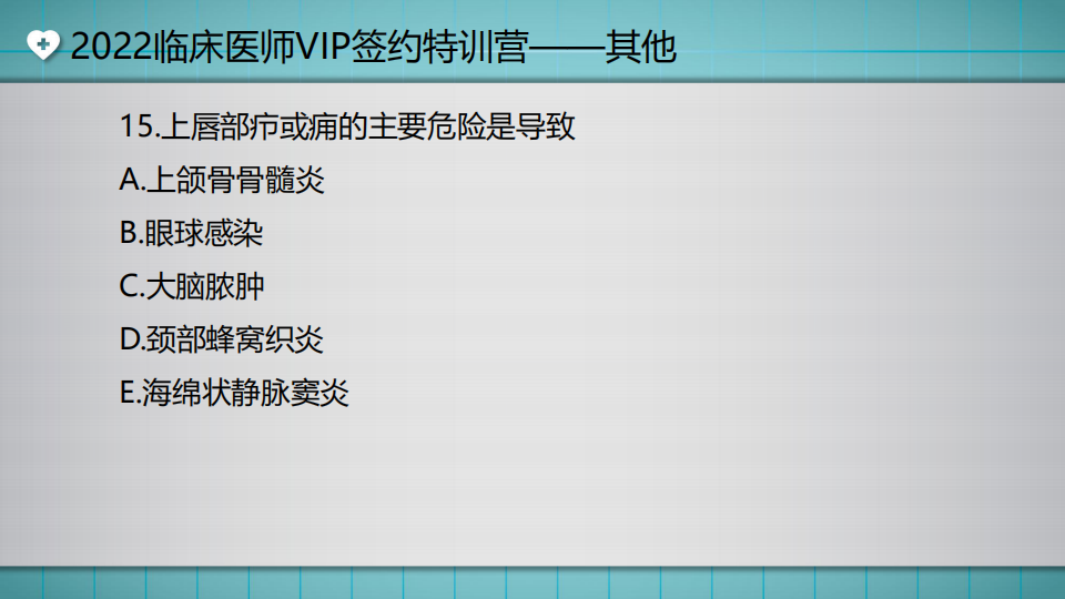 上唇部癤或癰的主要危險(xiǎn)是導(dǎo)致?湯以恒老師將為大家講解《其他》章節(jié)考試重點(diǎn),這也是VIP簽約特訓(xùn)營(yíng)強(qiáng)化階段的最后2節(jié)課了,直播課免費(fèi)公開(kāi)(直播回放入口>>)!快來(lái)?yè)屜茸鲱}吧!