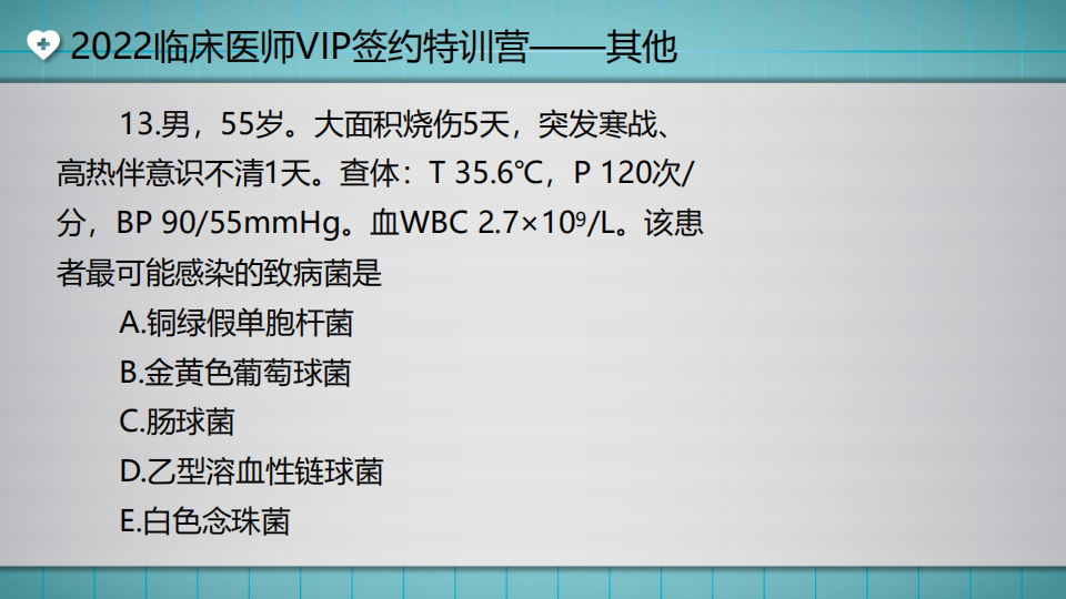 男,55歲。大面積燒傷5天,突發(fā)寒戰(zhàn)...湯以恒老師將為大家講解《其他》章節(jié)考試重點,這也是VIP簽約特訓(xùn)營強化階段的最后2節(jié)課了,直播課免費公開(直播回放入口>>)!快來搶先做題吧!