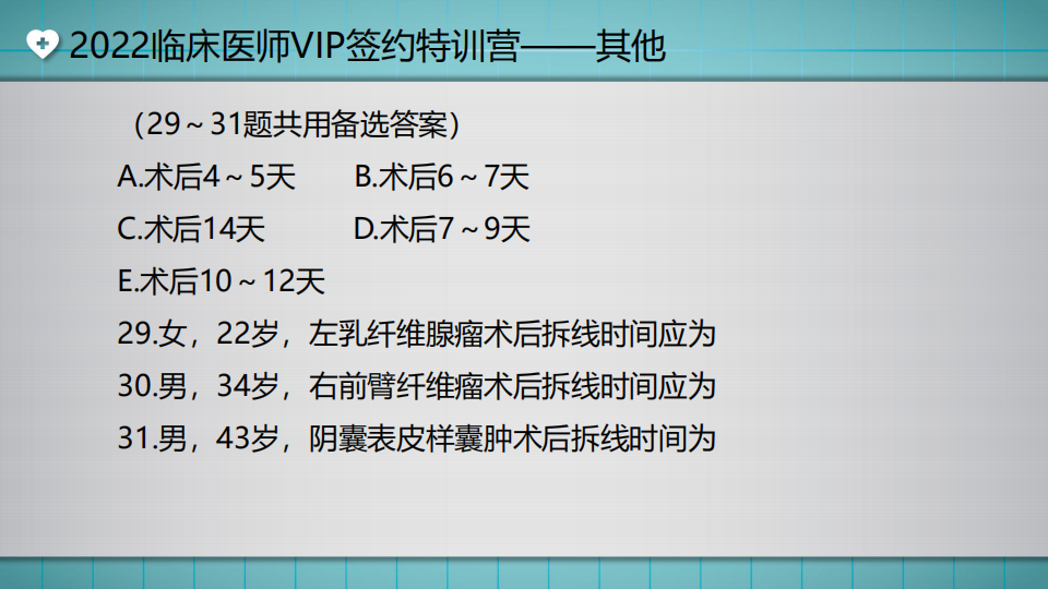 女,22歲,左乳纖維腺瘤術(shù)后拆線時(shí)間應(yīng)為?湯以恒老師將為大家講解《其他》章節(jié)考試重點(diǎn),這也是VIP簽約特訓(xùn)營(yíng)強(qiáng)化階段的最后2節(jié)課了,直播課免費(fèi)公開(kāi)(直播回放入口>>)!快來(lái)?yè)屜茸鲱}吧!