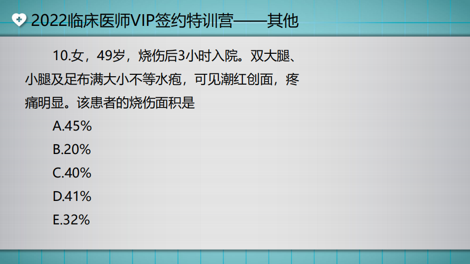 女,49歲,燒傷后3小時(shí)入院。燒傷面積...湯以恒老師將為大家講解《其他》章節(jié)考試重點(diǎn),這也是VIP簽約特訓(xùn)營強(qiáng)化階段的最后2節(jié)課了,直播課免費(fèi)公開(直播回放入口>>)!快來搶先做題吧!