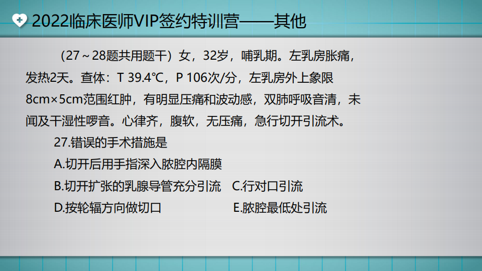 女32歲,哺乳期。左乳房脹痛,發(fā)熱2天...湯以恒老師將為大家講解《其他》章節(jié)考試重點(diǎn),這也是VIP簽約特訓(xùn)營(yíng)強(qiáng)化階段的最后2節(jié)課了,直播課免費(fèi)公開(直播回放入口>>)!快來搶先做題吧!