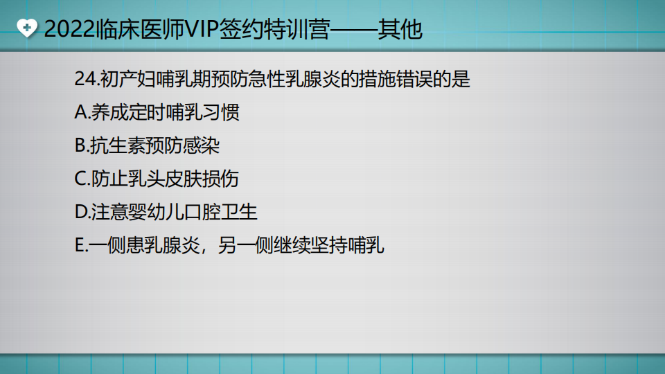 初產(chǎn)婦哺乳期預(yù)防急性乳腺炎的措施錯誤的是?湯以恒老師將為大家講解《其他》章節(jié)考試重點,這也是VIP簽約特訓(xùn)營強化階段的最后2節(jié)課了,直播課免費公開(直播回放入口>>)!快來搶先做題吧!