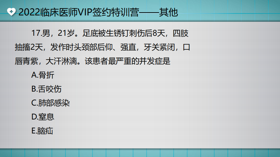 男,21歲。足底被生銹釘刺傷后8天...并發(fā)癥是...湯以恒老師將為大家講解《其他》章節(jié)考試重點(diǎn),這也是VIP簽約特訓(xùn)營(yíng)強(qiáng)化階段的最后2節(jié)課了,直播課免費(fèi)公開(直播回放入口>>)!快來搶先做題吧!