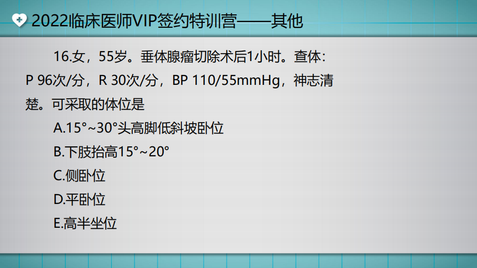 女,55歲。垂體腺瘤切除術(shù)后1小時...湯以恒老師將為大家講解《其他》章節(jié)考試重點,這也是VIP簽約特訓營強化階段的最后2節(jié)課了,直播課免費公開(直播回放入口>>)!快來搶先做題吧!