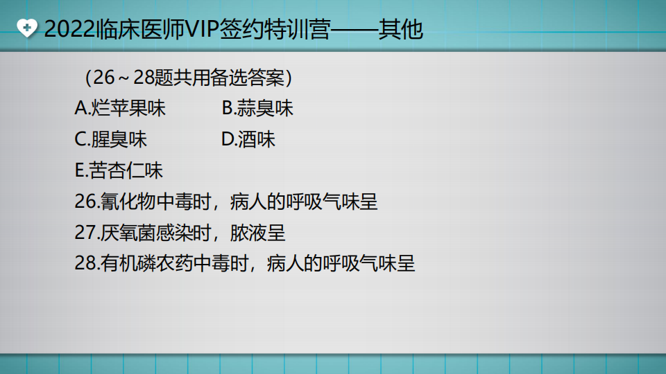 臨床水平測試:有機(jī)磷農(nóng)藥中毒時,病人的呼吸氣味呈?湯以恒老師將近期開展了兩場免費(fèi)公開課,為大家講解《其他》章節(jié)考試重點(diǎn),這也是VIP簽約特訓(xùn)營強(qiáng)化階段的最后2節(jié)課了,直播課免費(fèi)公開,還沒有參加直播,或者想再次重溫精彩瞬間的同學(xué),可以查看回放視頻哦。