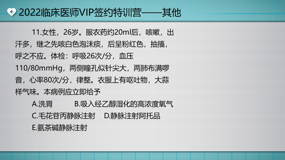 臨床水平測(cè)試:女26歲。服農(nóng)藥約20ml后,咳嗽,出汗多...湯以恒老師將近期開(kāi)展了兩場(chǎng)免費(fèi)公開(kāi)課,為大家講解《其他》章節(jié)考試重點(diǎn),這也是VIP簽約特訓(xùn)營(yíng)強(qiáng)化階段的最后2節(jié)課了,直播課免費(fèi)公開(kāi),還沒(méi)有參加直播,或者想再次重溫精彩瞬間的同學(xué),可以查看回放視頻哦。