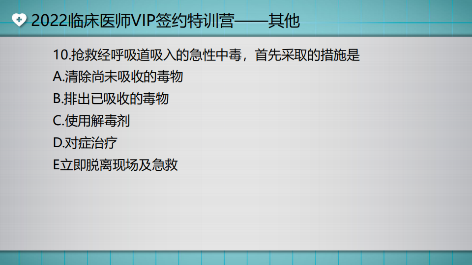 臨床水平測試:搶救經(jīng)呼吸道吸入的急性中毒,首先采取的措施是?湯以恒老師將近期開展了兩場免費(fèi)公開課,為大家講解《其他》章節(jié)考試重點,這也是VIP簽約特訓(xùn)營強(qiáng)化階段的最后2節(jié)課了,直播課免費(fèi)公開,還沒有參加直播,或者想再次重溫精彩瞬間的同學(xué),可以查看回放視頻哦。