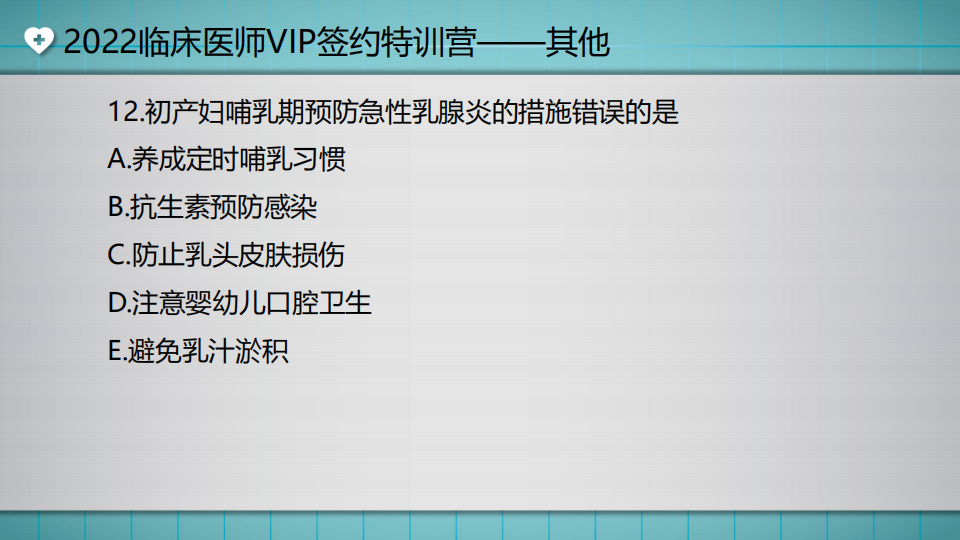 臨床水平測(cè)試:初產(chǎn)婦哺乳期預(yù)防急性乳腺炎的措施錯(cuò)誤的是?湯以恒老師將近期開(kāi)展了兩場(chǎng)免費(fèi)公開(kāi)課,為大家講解《其他》章節(jié)考試重點(diǎn),這也是VIP簽約特訓(xùn)營(yíng)強(qiáng)化階段的最后2節(jié)課了,直播課免費(fèi)公開(kāi),還沒(méi)有參加直播,或者想再次重溫精彩瞬間的同學(xué),可以查看回放視頻哦。