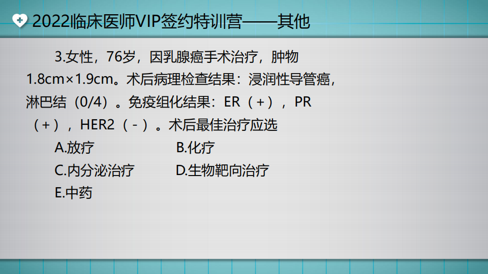 3.女性,76歲,因乳腺癌手術治療,腫物1.8cm×1.9cm。術后病理檢查結(jié)果:浸潤性導管癌,淋巴結(jié)(0/4)。免疫組化結(jié)果:ER(+),PR(+),HER2(-)。術后最佳治療應選