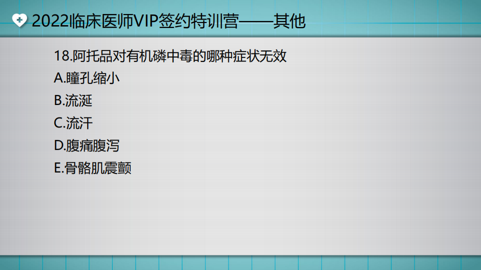 臨床水平測試:阿托品對有機磷中毒的哪種癥狀無效?湯以恒老師將近期開展了兩場免費公開課,為大家講解《其他》章節(jié)考試重點,這也是VIP簽約特訓(xùn)營強化階段的最后2節(jié)課了,直播課免費公開,還沒有參加直播,或者想再次重溫精彩瞬間的同學(xué),可以查看回放視頻哦。
