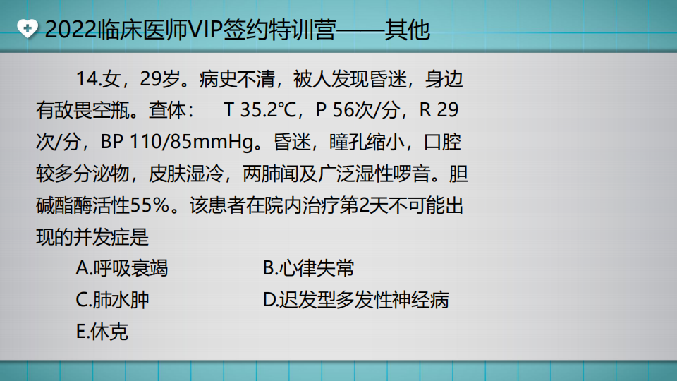 臨床水平測試:女29歲。被人發(fā)現(xiàn)昏迷,身邊有敵畏空瓶...湯以恒老師將近期開展了兩場免費公開課,為大家講解《其他》章節(jié)考試重點,這也是VIP簽約特訓營強化階段的最后2節(jié)課了,直播課免費公開,還沒有參加直播,或者想再次重溫精彩瞬間的同學,可以查看回放視頻哦。