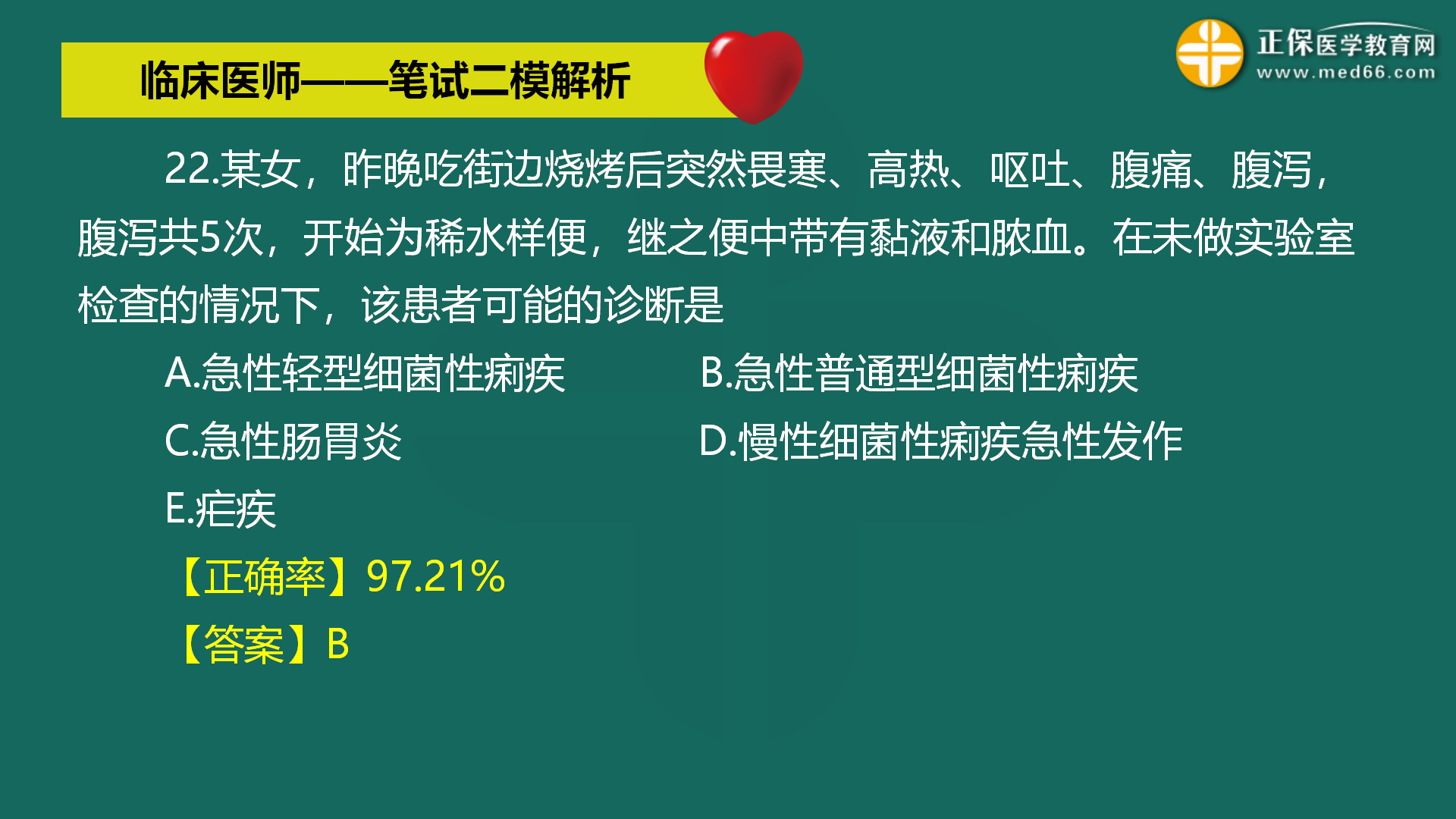 【急性普通型細菌性痢疾】某女,昨晚吃街邊燒烤后突然畏寒、高熱、嘔吐...全國2022年臨床執(zhí)業(yè)醫(yī)師??嫉诙拙砣肟诔掷m(xù)開放中(查看詳情>>),醫(yī)學教育網(wǎng)編輯整理分享疑難易錯題有關(guān)內(nèi)容如下: