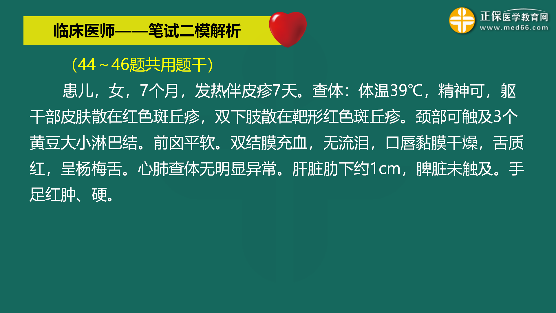 患兒,女,7個(gè)月,發(fā)熱伴皮疹7天。查體:體溫39℃,精神可,軀干部皮膚散在紅色斑丘疹,雙下肢散在靶形紅色斑丘疹。頸部可觸及3個(gè)黃豆大小淋巴結(jié)。前囟平軟。雙結(jié)膜充血,無(wú)流淚,口唇黏膜干燥,舌質(zhì)紅,呈楊梅舌。心肺查體無(wú)明顯異常。肝臟肋下約1cm,脾臟未觸及。手足紅腫、硬。