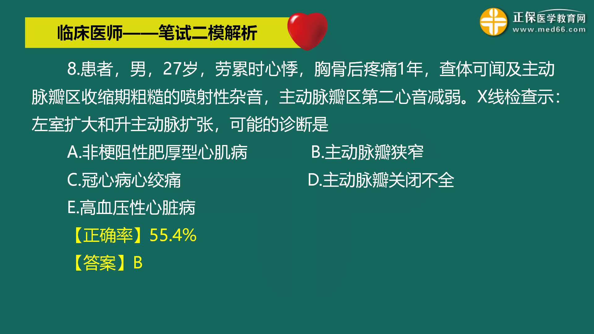 【主動脈瓣狹窄】患者,男,27歲,勞累時(shí)心悸,胸骨后疼痛1年...全國2022年臨床執(zhí)業(yè)醫(yī)師模考第二套卷入口持續(xù)開放中(查看詳情>>),醫(yī)學(xué)教育網(wǎng)編輯整理分享疑難易錯題有關(guān)內(nèi)容如下: