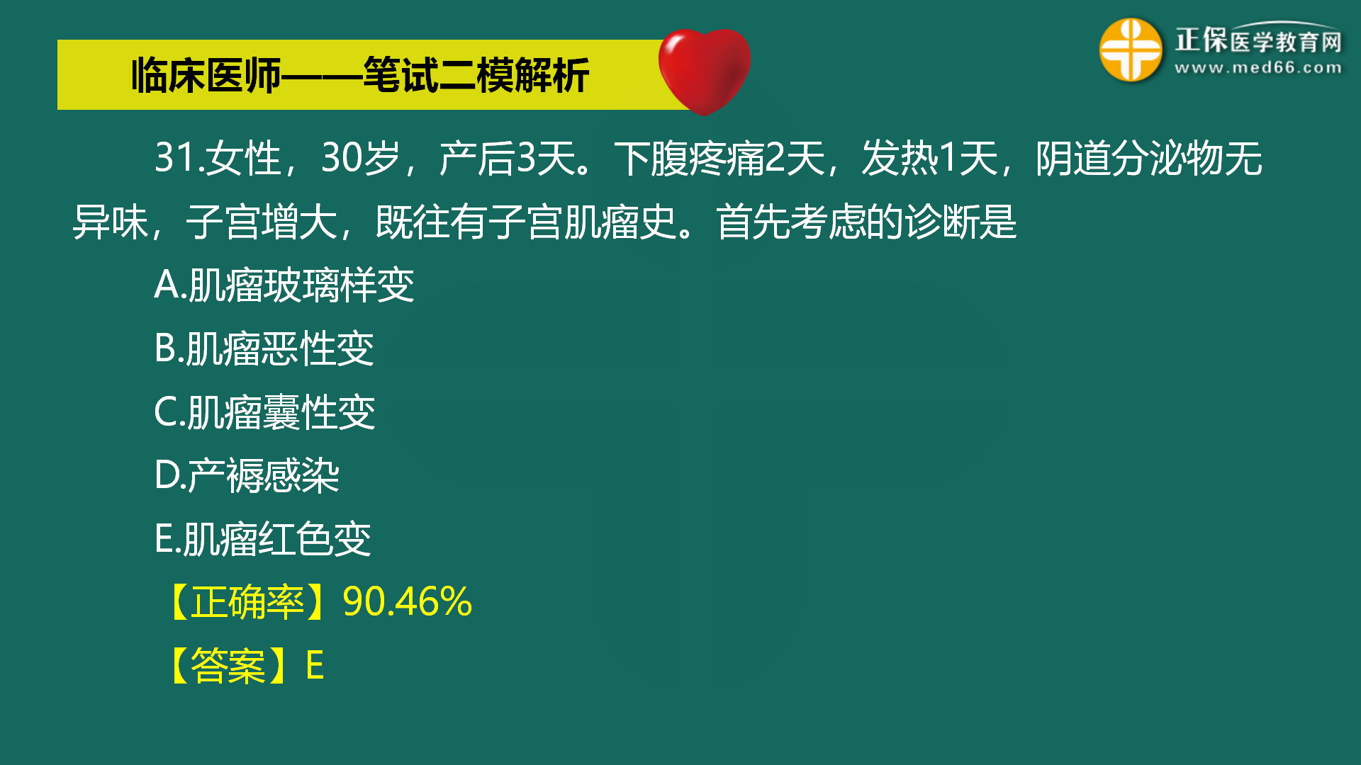 【肌瘤紅色變】女性,30歲,產(chǎn)后3天。下腹疼痛2天,發(fā)熱1天...全國(guó)2022年臨床執(zhí)業(yè)醫(yī)師??嫉诙拙砣肟诔掷m(xù)開放中(查看詳情>>),醫(yī)學(xué)教育網(wǎng)編輯整理分享疑難易錯(cuò)題有關(guān)內(nèi)容如下: