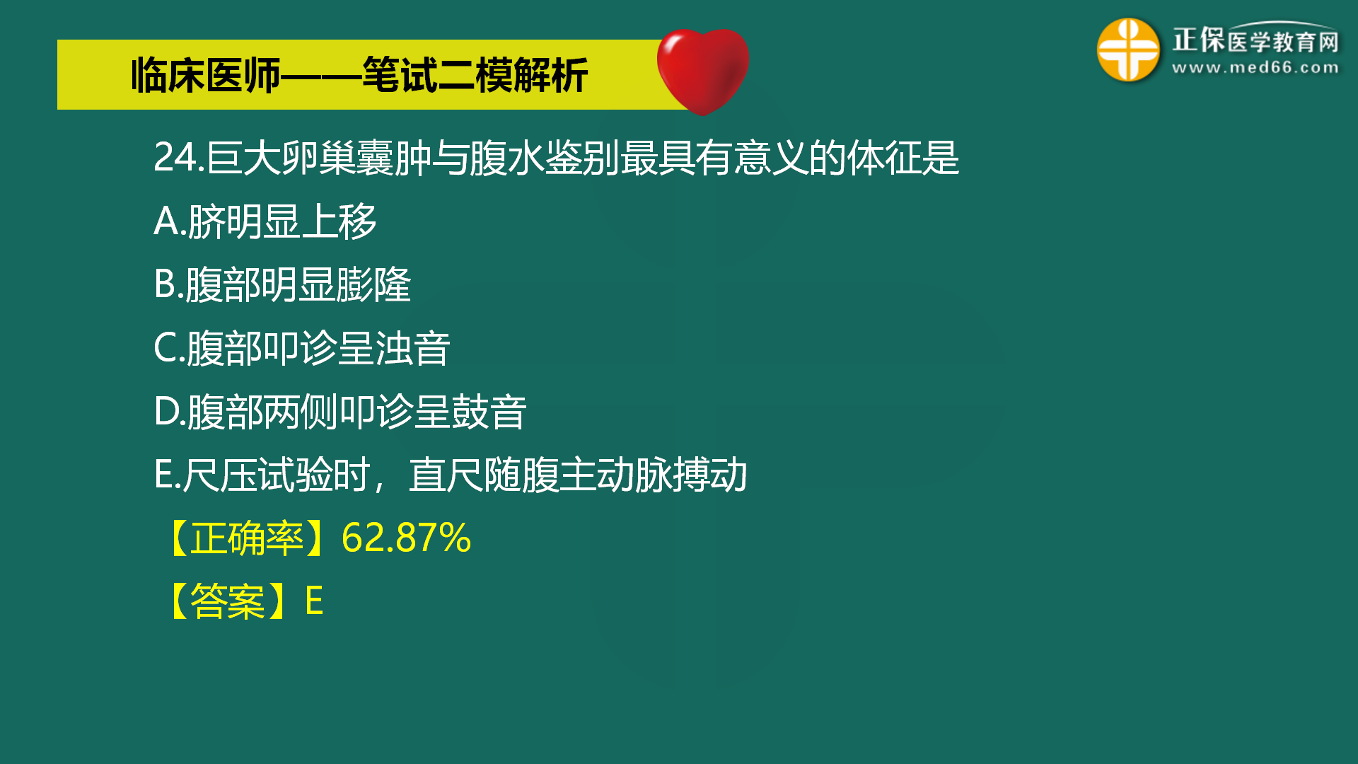 【正確率62.87%】巨大卵巢囊腫與腹水鑒別最具有意義的體征是?全國2022年臨床執(zhí)業(yè)醫(yī)師模考第二套卷入口持續(xù)開放中(查看詳情>>),醫(yī)學(xué)教育網(wǎng)編輯整理分享疑難易錯題有關(guān)內(nèi)容如下: