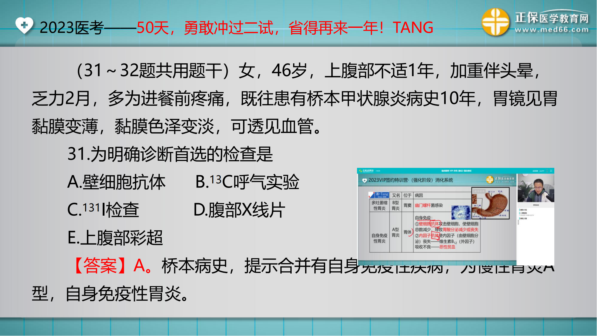(31~32題共用題干)女,46歲,上腹部不適1年,加重伴頭暈,乏力2月,多為進(jìn)餐前疼痛,既往患有橋本甲狀腺炎病史10年,胃鏡見胃黏膜變薄,黏膜色澤變淡,可透見血管。
