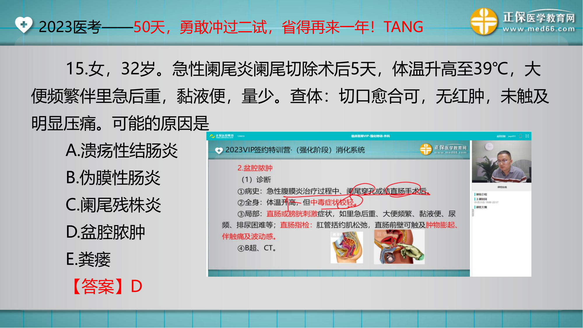 15.女,32歲。急性闌尾炎闌尾切除術(shù)后5天,體溫升高至39℃,大便頻繁伴里急后重,黏液便,量少。查體:切口愈合可,無紅腫,未觸及明顯壓痛??赡艿脑蚴?/strong>