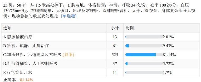 詳情多根多處肋骨骨折——全國臨床執(zhí)業(yè)醫(yī)師??颊_率81.14%!2022年臨床執(zhí)業(yè)醫(yī)師考生有福啦,醫(yī)學(xué)教育網(wǎng)為您精心挑選了50道基礎(chǔ)摸底模擬測試題,快來測測你的水平吧!立即免費參與>>