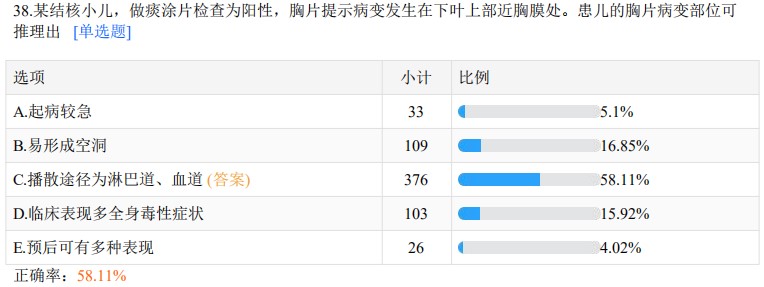 【答案解析】 這是一道比較難的推理題,主要考查考生的知識(shí)點(diǎn)綜合運(yùn)用能力從題干胸片病變部位來(lái)看,病變位于“下葉上部近胸膜處”,此處多為原發(fā)性肺結(jié)核的好發(fā)部位(病理學(xué)),而ABDE均為繼發(fā)性肺結(jié)核的特點(diǎn),而C為原發(fā)性肺結(jié)核常見(jiàn)的播散途徑。