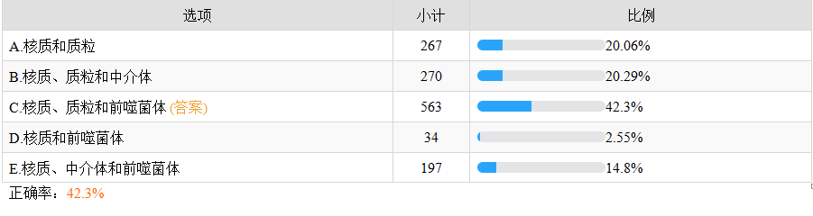 【答案解析】A和D選項(xiàng)都是細(xì)菌的遺傳物質(zhì),但不完全。細(xì)菌的遺傳物質(zhì)是DNA,DNA借其構(gòu)成的特定基因傳遞遺傳信息。細(xì)菌的基因組是指細(xì)菌染色體和染色體以外遺傳物質(zhì)所攜帶基因的總稱。染色體外的遺傳物質(zhì)是指質(zhì)粒DNA和轉(zhuǎn)位因子等。選A、D者并沒有錯(cuò),但是不完全。而中介體是細(xì)菌細(xì)胞膜內(nèi)陷形成的囊狀物,不含DNA,故B、E選項(xiàng)不正確。