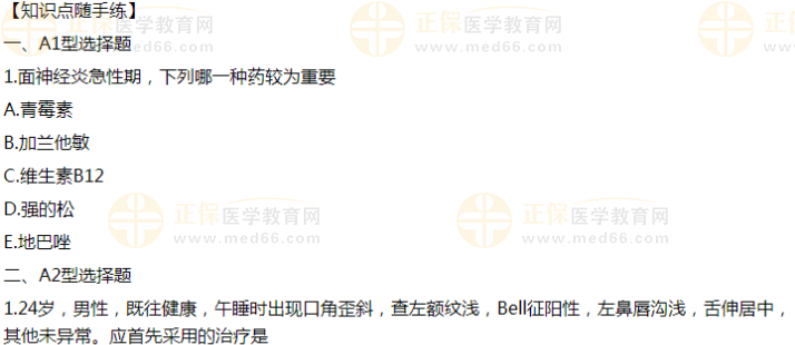 關(guān)于“面神經(jīng)炎急性期的藥物治療——臨床執(zhí)業(yè)醫(yī)師試題練習(xí)”的內(nèi)容,相信很多臨床執(zhí)業(yè)醫(yī)師考生都在關(guān)注,醫(yī)學(xué)教育網(wǎng)編輯為大家整理了具體的模擬試題,詳情如下: