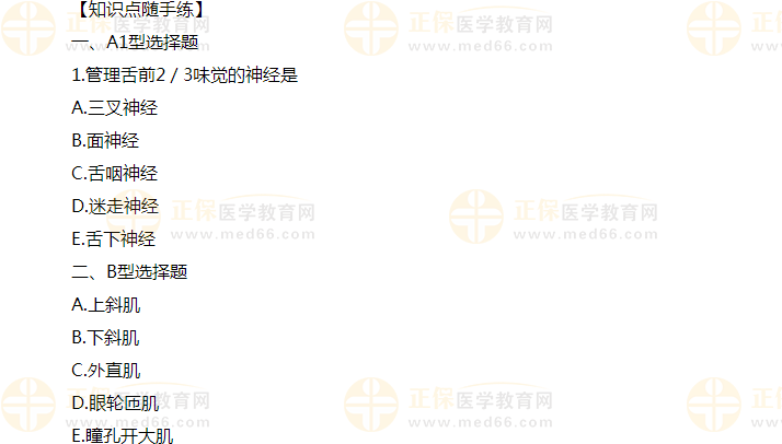 【答案解析】動眼神經(jīng)支配上瞼提肌、上直肌、下直肌、內(nèi)直肌、下斜肌等,另外瞳孔括約肌和睫狀肌是由動眼神經(jīng)核上部的埃-魏核發(fā)出的副交感纖維支配的,瞳孔開大肌是由交感神經(jīng)支配的,故2題選擇B,3題選擇E;滑車神經(jīng)支配上斜??;外展神經(jīng)支配外直肌,故1題選擇A。