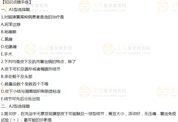 該知識點(diǎn)考核較少,但有幾個題眼必須掌握:腦實(shí)質(zhì)病變、癲癇+和阿苯達(dá)唑。在記住以上內(nèi)容的基礎(chǔ)上需要掌握眼囊蟲病禁止殺蟲治療,應(yīng)先手術(shù)摘除,再行驅(qū)蟲治療??荚嚩酁锳1或者A2型題。
