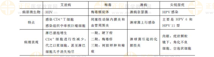 艾滋病主要通過感染CD4+T細(xì)胞而致??;而梅毒主要侵犯的是閉塞性動(dòng)脈內(nèi)膜炎和血管周圍炎;淋病是通過淋球菌的上行感染而導(dǎo)致的化膿性炎癥;尖銳濕疣是通過HPV感染而產(chǎn)生的空泡狀細(xì)胞。
