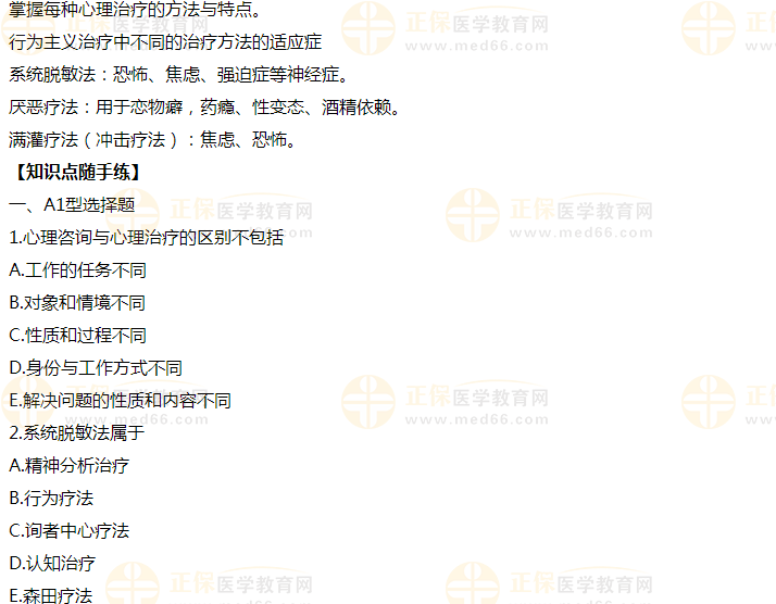關(guān)于“2021臨床執(zhí)業(yè)醫(yī)師經(jīng)典習(xí)題:心理咨詢與心理治療的區(qū)別不包括”的內(nèi)容,相信很多臨床執(zhí)業(yè)醫(yī)師考生都在關(guān)注,醫(yī)學(xué)教育網(wǎng)編輯為大家整理了心理治療的主要方法相關(guān)模擬試題及答案解析,詳情如下: