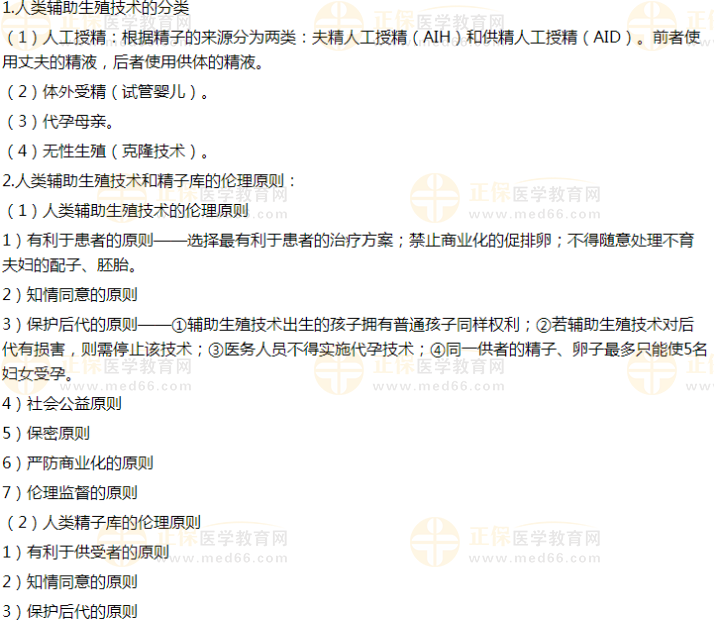 該知識點重點掌握人類輔助生殖技術(shù)和精子庫的倫理原則,我國人體器官移植的倫理準(zhǔn)則,胚胎干細(xì)胞研究中的倫理要求??偟脕碚f這章內(nèi)容比較新、比較多,但不是很重要,因此主要是按照醫(yī)學(xué)道德的基本原則把相關(guān)內(nèi)容過一下,形成一個整體的印象和把握。