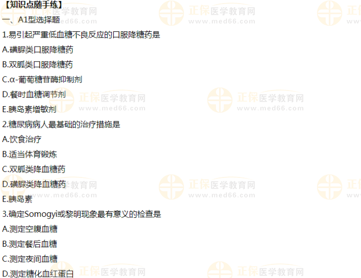 關于“臨床執(zhí)業(yè)醫(yī)師模擬試題——腎功能不全患者較為安全的降糖藥練習”的內(nèi)容,是很多臨床執(zhí)業(yè)醫(yī)師資格考生都很關心的內(nèi)容,為了幫助廣大臨床執(zhí)業(yè)醫(yī)師資格考生順利復習,醫(yī)學教育網(wǎng)老師特整理了“糖尿病的治療”具體的知識點和試題,快來學習: