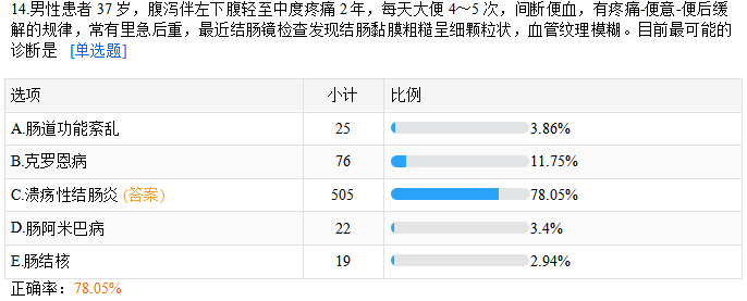 2022年臨床醫(yī)師“潰瘍性結(jié)腸炎”案例題模考正確率78.05%