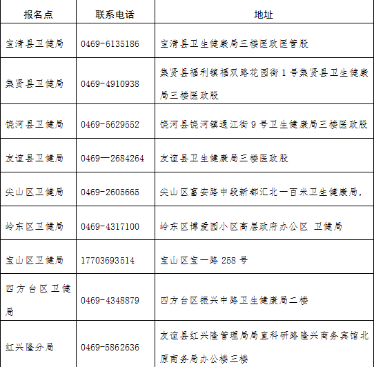 各縣區(qū)、紅興隆分局報(bào)名點(diǎn)現(xiàn)場(chǎng)確認(rèn)聯(lián)系電話及地址: