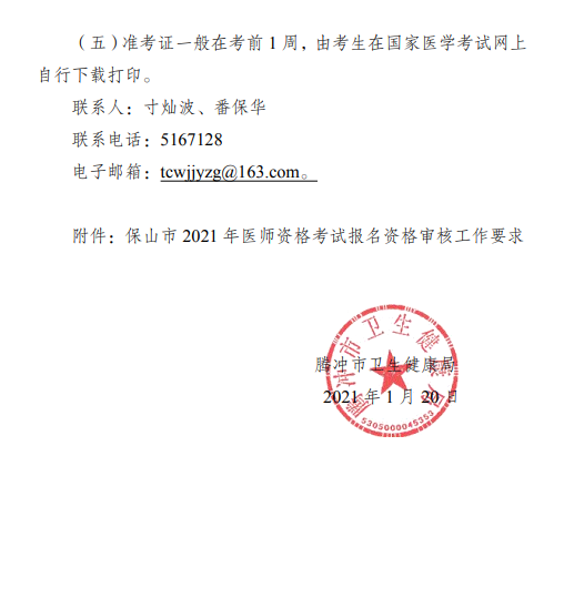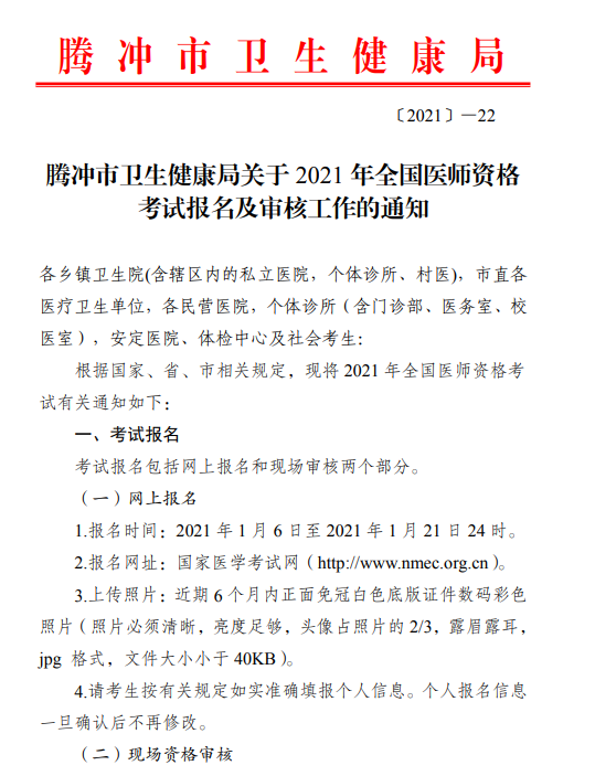 原文下載:騰沖市關(guān)于2021年全國(guó)醫(yī)師資格考試報(bào)名審核工作的通知