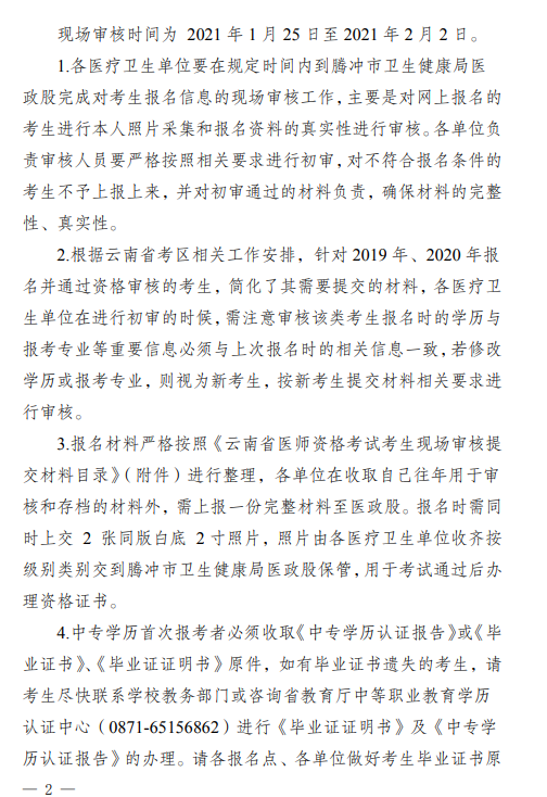 云南騰沖2021年臨床執(zhí)業(yè)醫(yī)師現(xiàn)場(chǎng)審核時(shí)間、地點(diǎn)材料等事項(xiàng)安排