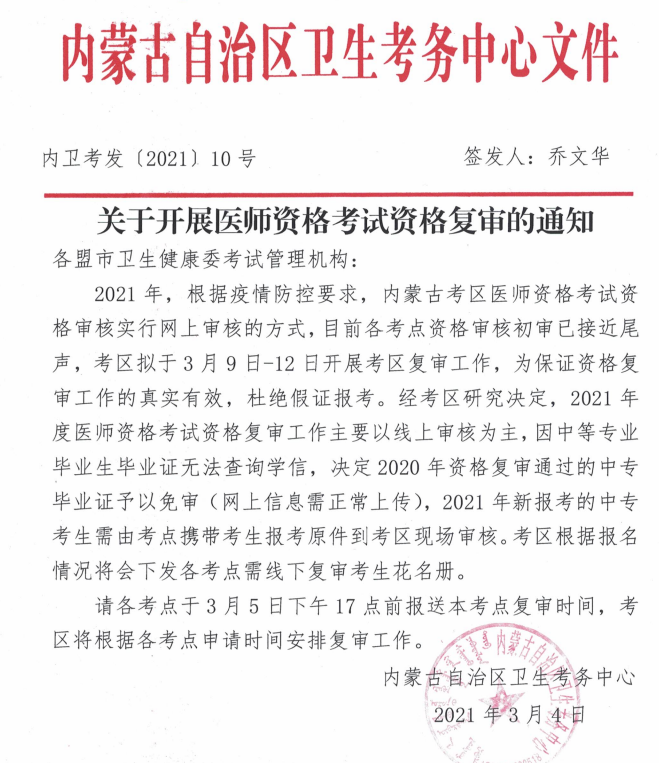 2021年,根據(jù)疫情防控要求,內(nèi)蒙古考區(qū)醫(yī)師資格考試資格審核實(shí)行網(wǎng)上審核的方式,目前各考點(diǎn)資格審核初審已接近尾聲,考區(qū)擬于3月9日-12日開展考區(qū)復(fù)審工作,為保證資格復(fù)審工作的真實(shí)有效,杜絕假證報(bào)考。經(jīng)考區(qū)研究決定,2021年度醫(yī)師資格考試資格復(fù)審工作主要以線上審核為主,因中等專業(yè)畢業(yè)生畢業(yè)證無法查詢學(xué)信,決定2020年資格復(fù)審?fù)ㄟ^的中專畢業(yè)證予以免審(網(wǎng)上信息需正常上傳),2021年新報(bào)考的中??忌栌煽键c(diǎn)攜帶考生報(bào)考原件到考區(qū)現(xiàn)場審核。考區(qū)根據(jù)報(bào)名情況將會(huì)下發(fā)各考點(diǎn)需線下復(fù)審考生花名冊。請各考點(diǎn)于3月5日下午17點(diǎn)前報(bào)送本考點(diǎn)復(fù)審時(shí)間,考區(qū)將根據(jù)各考點(diǎn)申請時(shí)間安排復(fù)審工作。