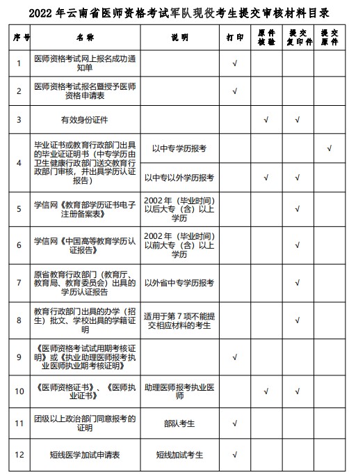 2022年云南省醫(yī)師資格考試軍隊(duì)現(xiàn)役考生提交審核材料目錄