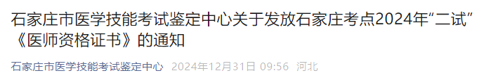 石家莊市醫(yī)學(xué)技能考試鑒定中心關(guān)于發(fā)放石家莊考點(diǎn)2024年“二試”《醫(yī)師資格證書(shū)》的通知
