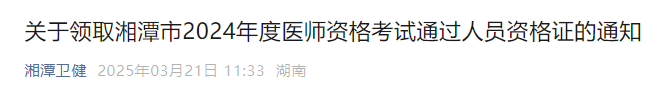 關(guān)于領(lǐng)取湘潭市2024年度醫(yī)師資格考試通過(guò)人員資格證的通知
