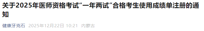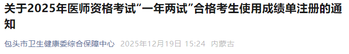 內(nèi)蒙古牙克石2025年臨床執(zhí)業(yè)醫(yī)師“一年兩試”注冊開始!請相關(guān)考生及時查看,盡早完成注冊。