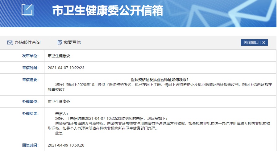 重慶市衛(wèi)健委回復(fù):醫(yī)師資格證書(shū)請(qǐng)聯(lián)系考點(diǎn)領(lǐng)取。醫(yī)師執(zhí)業(yè)證書(shū)提交注冊(cè)申請(qǐng)材料通過(guò)后方可領(lǐng)取,如是擬執(zhí)業(yè)機(jī)構(gòu)統(tǒng)一辦理注冊(cè)請(qǐng)聯(lián)系擬執(zhí)業(yè)機(jī)構(gòu)領(lǐng)取證書(shū),如是個(gè)人辦理注冊(cè)請(qǐng)?jiān)跀M執(zhí)業(yè)機(jī)構(gòu)所在衛(wèi)生健康部門(mén)辦理。