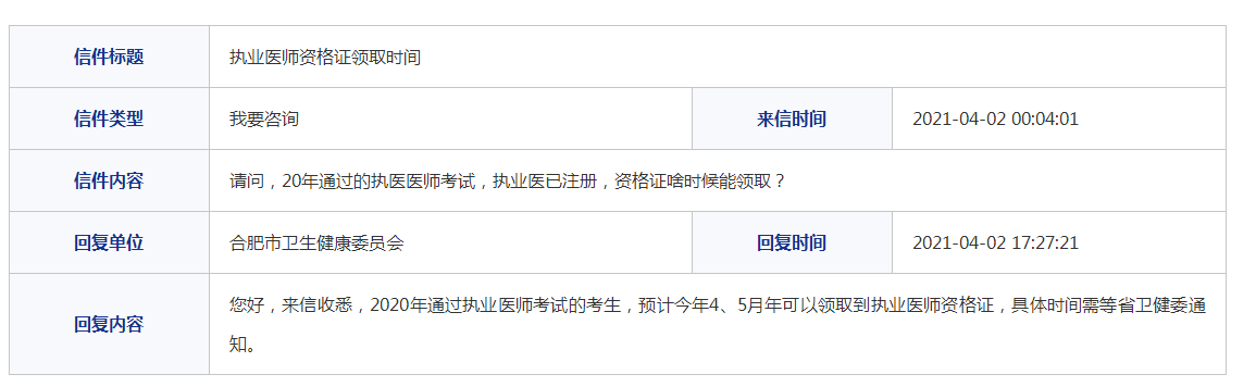 合肥衛(wèi)健委回答:您好,來信收悉,2020年通過執(zhí)業(yè)醫(yī)師考試的考生,預計今年4、5月年可以領取到執(zhí)業(yè)醫(yī)師資格證,具體時間需等省衛(wèi)健委通知。