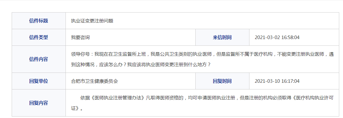 合肥衛(wèi)健委回答:依據(jù)《醫(yī)師執(zhí)業(yè)注冊管理辦法》凡取得醫(yī)師資格的,均可申請醫(yī)師執(zhí)業(yè)注冊,但是注冊的機構(gòu)必須取得《醫(yī)療機構(gòu)執(zhí)業(yè)許可證》。