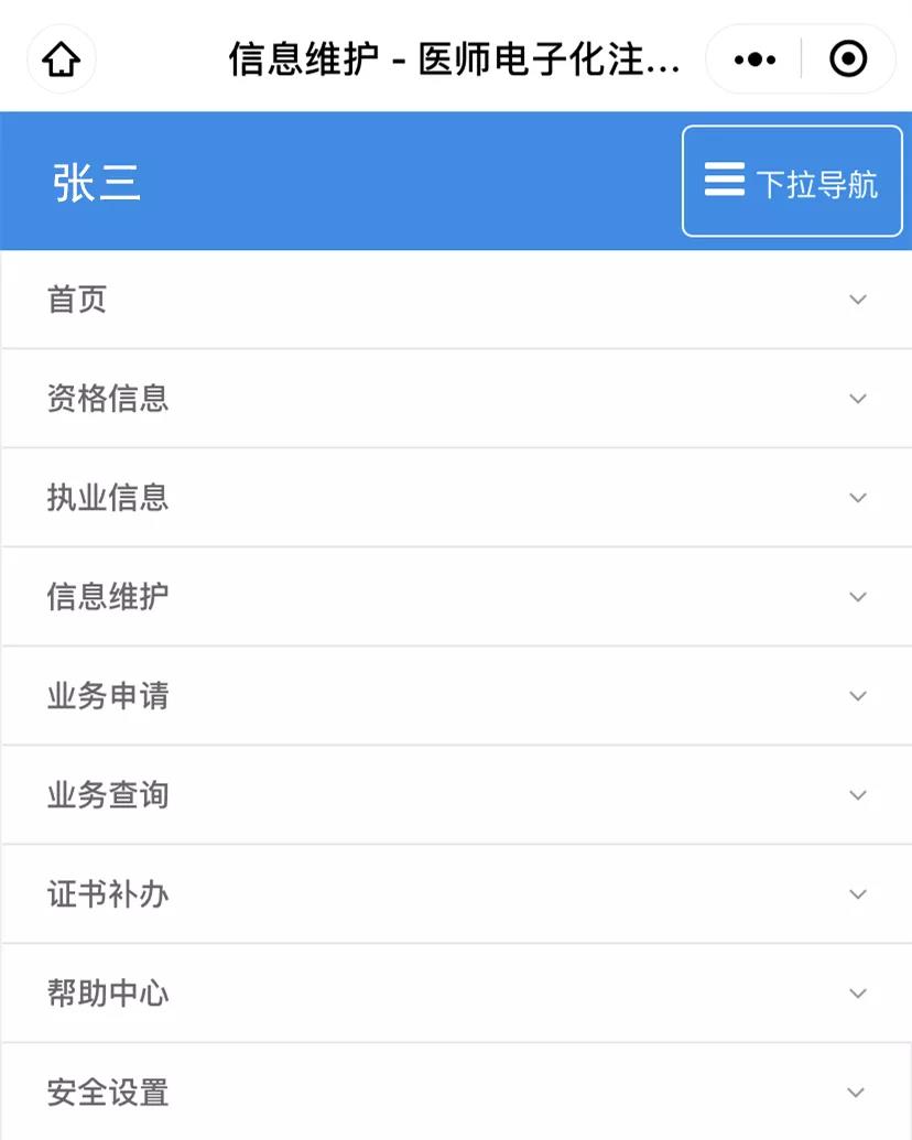 4、點擊右上角【下拉導(dǎo)航】進(jìn)入【信息維護(hù)】功能