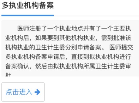 3、在醫(yī)師個(gè)人端“業(yè)務(wù)申請(qǐng)”中選擇“多執(zhí)業(yè)機(jī)構(gòu)備案”申請(qǐng)“點(diǎn)擊進(jìn)入”